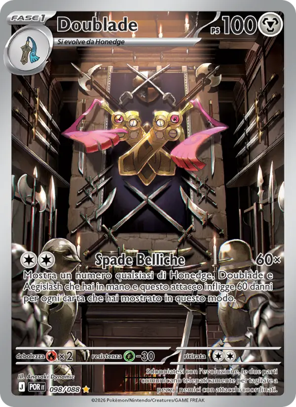 Mostra un numero qualsiasi di Honedge, Doublade e Aegislash che hai in mano e questo attacco infligge 60 danni per ogni carta che hai mostrato in questo modo.